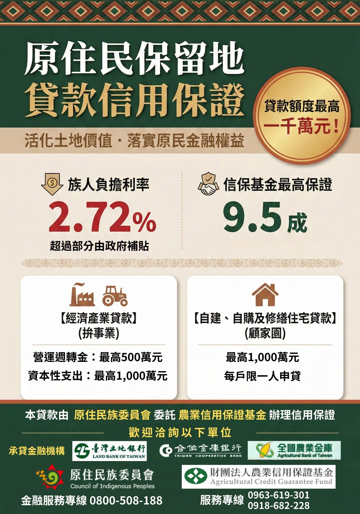 為保障原住民族金融權益,原住民族委員會(下簡稱原民會)訂定「原住民保留地貸款信用保證作業要點」,委託財團法人農業信用保證基金辦理「原住民保留地貸款信用保證業務」政策說明會。全國規劃辦理22場,新竹縣辦理場次時間地點如下(場次資訊如附件):